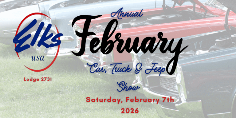 Join us for our Annual February Car, Truck & Jeep Show! Over 60 trophies, music, food & Drinks – good times! Come help us raise funds for the Elks Lodge!